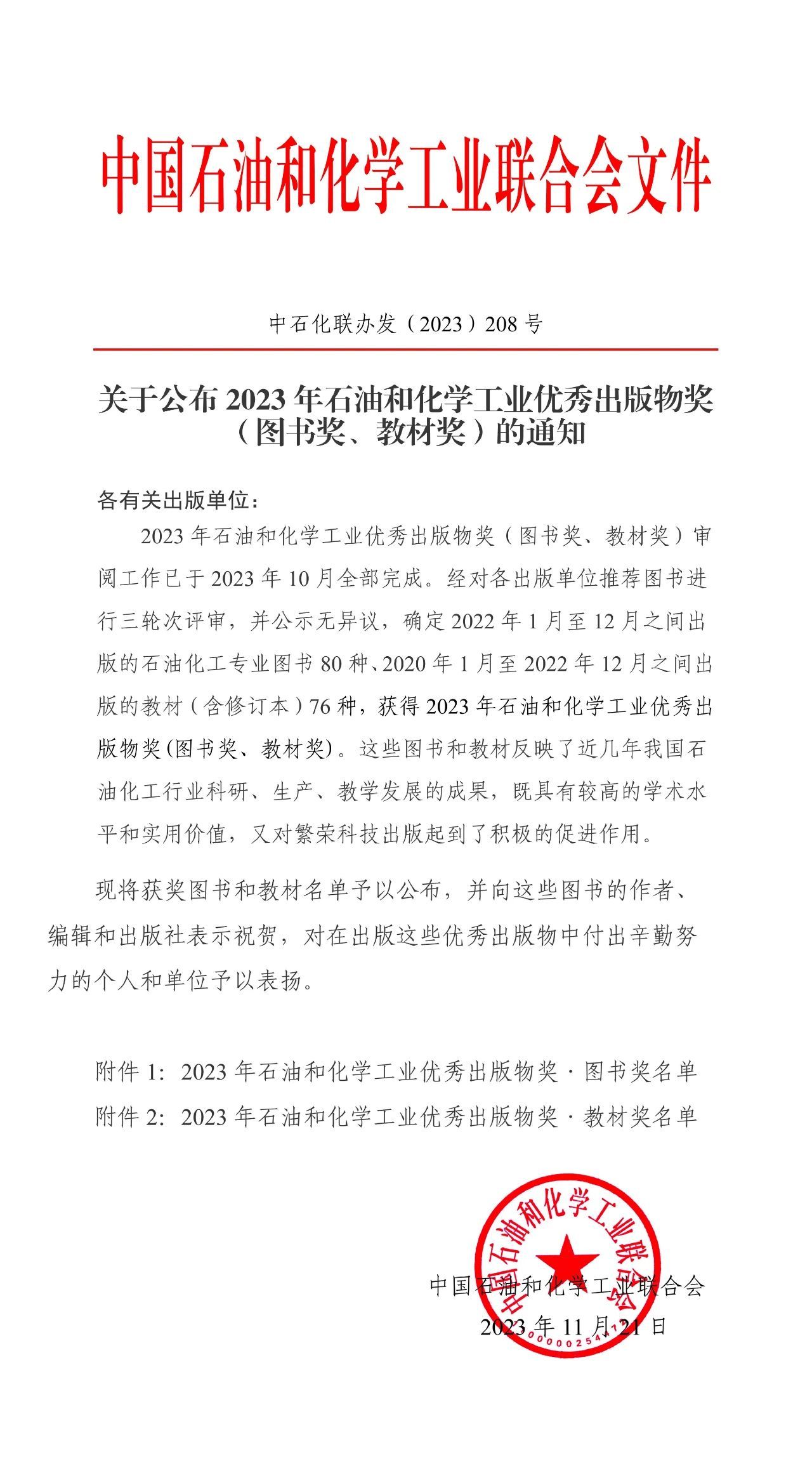 本次优秀出版物奖评选活动由中国石油和化学工业联合会主办,涵盖了2022年1月至12月之间出版的石油化工专业图书、2020年1月至2022年12月之间出版的教材(含修订本),经过对各出版单位推荐图书进行三轮次评审,最终评选出在石油化工行业具有创造性贡献的著作和教材。这些图书和教材反映了近几年我国石油化工行业科研、生产、教学发展的成果,既具有较高的学术水平和实用价值,又对繁荣科技出版起到了积极的促进作用。